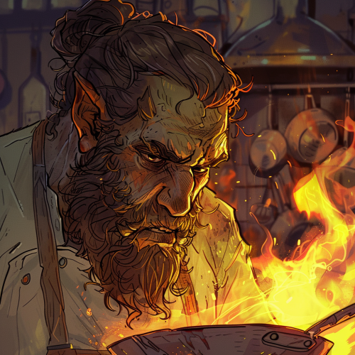 a half orc in a kitchen. The half orc has a scruffy beard. The beard is salt and pepper. The half orc looks panicked. The half orc is holding a pan. The pan has flames coming out of it. The half orc is wearing a chef's hat. The half orc is wearing an apron. The half orc is quite skinny. The half orc has a paunch. Anime style. --v 6.0