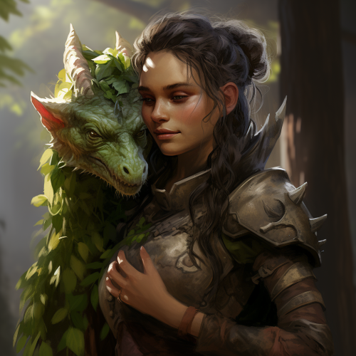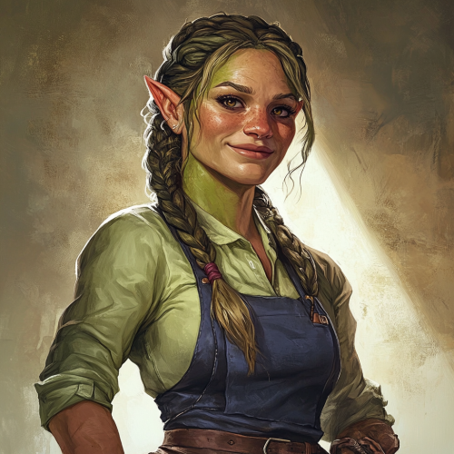 dungeon and dragons character art of a friendly looking, half orc woman. She has a a maternal appearance and seems welcoming in her apron with braided hair