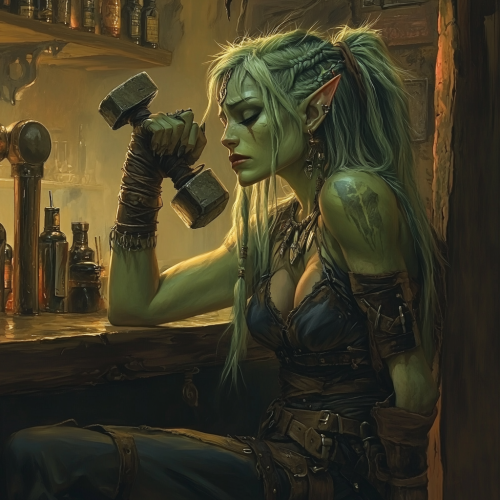 green-skinned female half-orc pirate, holding a maul-hammer, sitting at a bar in Hell, wishing she was back on her ship on the ocean, sad beauty, friends planning, fantasy scene art