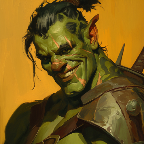 portrait of a half orc male, green skin, black topknot hairstyle, tattoo of a lightning bolt under one eye, broken nose with black eyes and a plasters, smiling with short tusks, wearing dark old and dented medieval armour, brown gouache background, cinematic lighting, Alex Ross illustrian, JC Leyendecker illustrian, Magic the Gathering artwork style, oil painting, Studio Ghibli artwork style, Eiichiro Oda artwork style, anime artwork style, anime, cinematic, HD, 8K, --niji 6