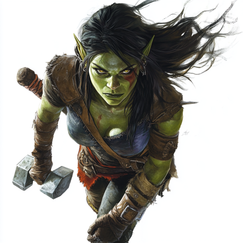 dnd vtt token of a green-skinned female half-orc pirate black-hair barbarian looking-forward, carrying a warhammer, top down, from above, fantasy virtual game, clear background