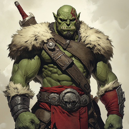 A full-body shot of a friendly half-orc warrior with green skin and furs on his shoulders, wearing red sashes around the waist in the style of James Bama. Detailed character illustrations, comic book art style, detailed background elements, adventure-themed , and a dark beige and white color palette in the style of Brian Stelfreeze.