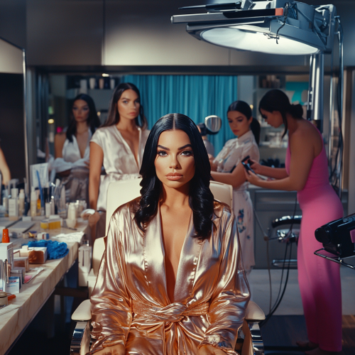 central character directly looking at camera 'kendall jenner' wearing silk dressing gown in a modern tv set sitting in makeup chair with female makeup artists and hairdressers standing applying makeup and blow dryning her hair as she looks directly forward, on tv set, real photography, extreme detail, ar 3:4 --v 6.1