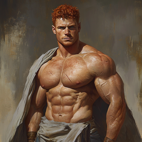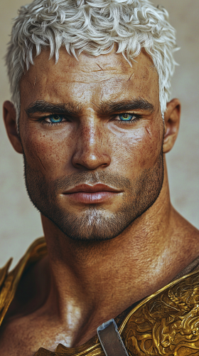 Portrait of ruggedly handsome, Hyper muscular half orc, bright blue eyes with gold, short curly white hair, defined muscles, pronounced features, hyper muscular, different color eyes, wide Grecian nose, strong square jaw, defined cheek bones, masculine features, freckles, wearing golden high elf armor, realistic. Realistic. --ar 9:16