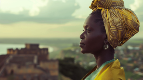 a african 25years old queen seeing her big Kingdom from top of his palace, realistic --ar 16:9 --v 6.0