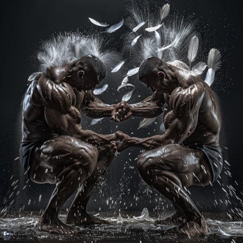 super realistic photograph of two super strong body builders struggling to pick up a feather HDR 4k extra detailed