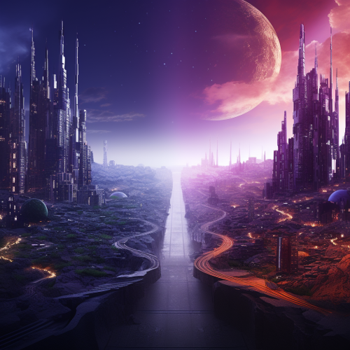 future city on the left and dystopian dystopia on the right, 3d, dark purple background