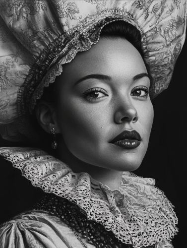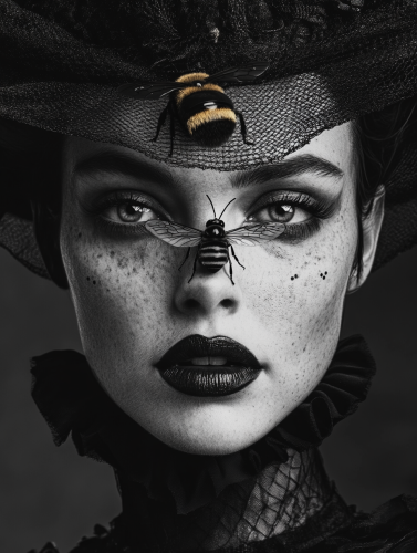 "Hyperrealistic and highly detailed black and white portrait of a severe and tough 19th century queen, dressed and styled according to the fashion of the time. A bee is perched on her nose. Focus on the extreme realism of the skin, highlighting visible pores, fine lines and the thin folds of the lips as the central elements of the image. Perfect image like a photo. The texture of the skin and the details are of paramount importance. --ar 3:4