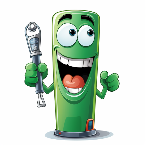 a 50's cartoon style animation of a green smiling anthropomorphic thermos holding a chainsaw with both hands with a white background