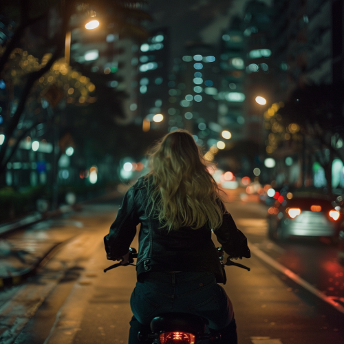 blonde woman riding a bike at night in São Paulo, the shot is from behind