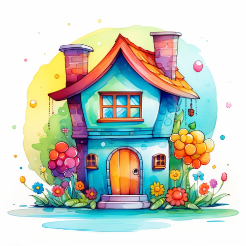 On a white background draw a colorful sketch of a cute house with a peaceful smile on it, photoreal