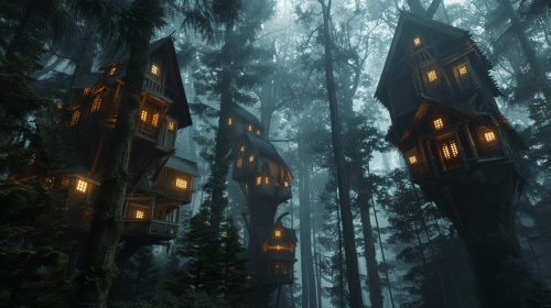 In the forest, houses on top of tall trees, angle looking up, dim light, light shining in, realistic --ar 16:9