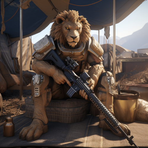 lion holding m249 in a tent, wearing UNSC uniform, 4k, unreal5, high render, realistic