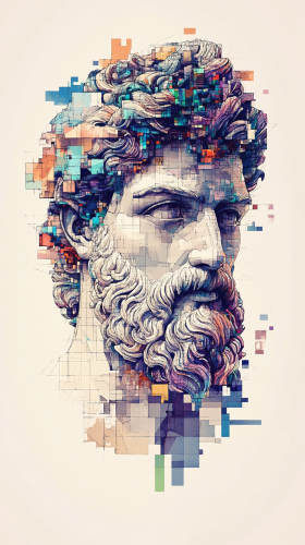 draw a sketch of a tattoo in the style of surrealism, which will depict: - a plaster head of Zeus, a symbol of strength, success and wealth. David is made up of pixel squares. One half of Zeus's face is a painting by Salvador Dali. graphic with color elements, minimalist, realistic. Add Chinese style, the style of a Chinese tattoo with a dragon and a Chinese lantern. Eclecticism. --ar 9:16 --v 6.1