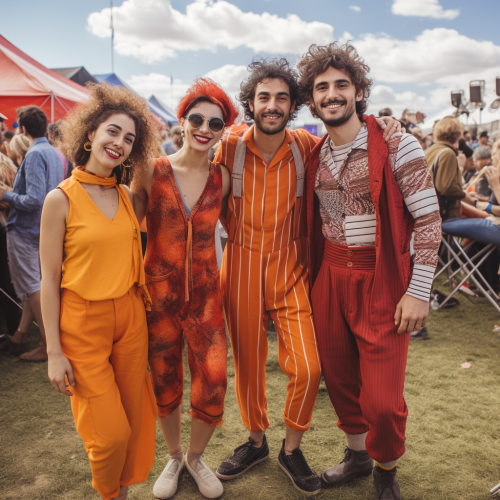 An orange kissing booth with orange lip stain prints for a Fanta soda brand activation at a music festival in the day time. There are Fanta cans as the production design and orange lip stain prints. There are 16-18 year old young cool trendy diverse teens in various colors and cool clothing. shot in 35mm, full frame shot - Hyper realistic - realistic - ultra detailed q 2 v 5 --ar 16:9