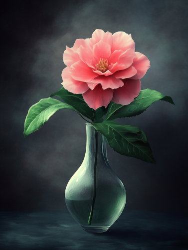 realistic studio photo: camelia flower in a vase, the background is a dark with soft light and mist, in plain finish studio photography, intricate details, 4k --ar 3:4 --style raw --s 50