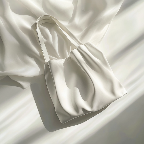Photorealistic blank white tote bag flay lay with a birdseye shot taken by a high-end fashion photographer in a professional photography studio with a clean white surface.