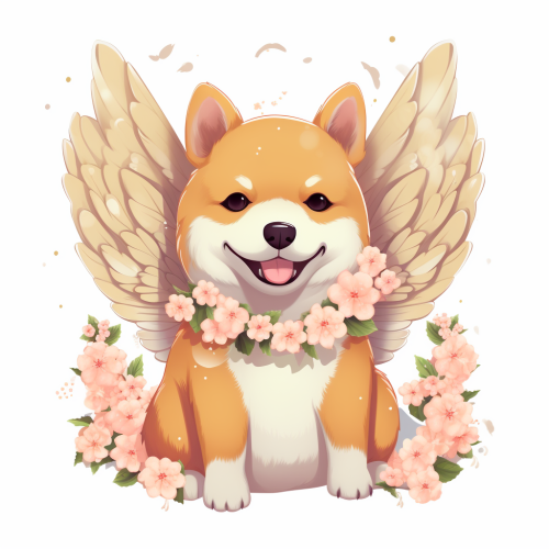 Adorable kawaii Full body shiba Dog ultra cute with angels wings and a wreath of flowers on his head, vector, white background
