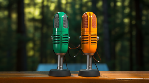 A swiss army knife between two podcast microphones with a color scheme of green and orange on a large wooden table set in the woods --ar 16:9