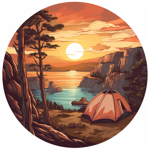 Symbol in the form of a magnifying glass focused on a tent, minimalism.