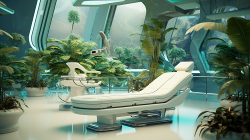 white mimalistic spa room with 2 white simple nail vanity tables in the middle of the room and light blue rolling stools either side of the tables there are simple walls there are lounge seats in the foreground
