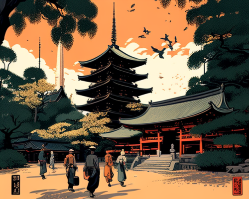 Ukiyo-e style, a temple in Kyoto with red brick walls and a three-tiered pagoda tower, many people walking around the base of the main hall, green trees surrounding it, birds flying overhead, vibrant colors, and high contrast. --v 4 --ar 5:4