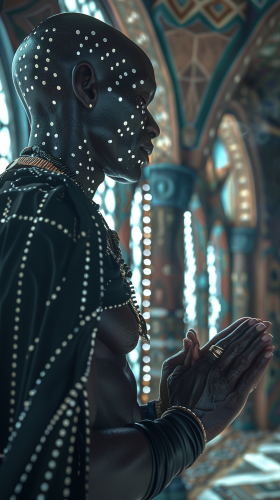 black, bald, African man, painted white dots spread across his body, African necklaces, praying, spiritual African clothes, spiritual temple in the background, sharp detail, high quality, high graphics, hyper realism, lightroom, cinematic photo, photo shot by arri, picture taken by canon, picture taken by fuji, professional lighting, film lighting, 35mm, anamorphic, picture taken by kodak cinematography, photorealistic, bokeh focus, 4k, artstarion --v 6.0 --ar 9:16