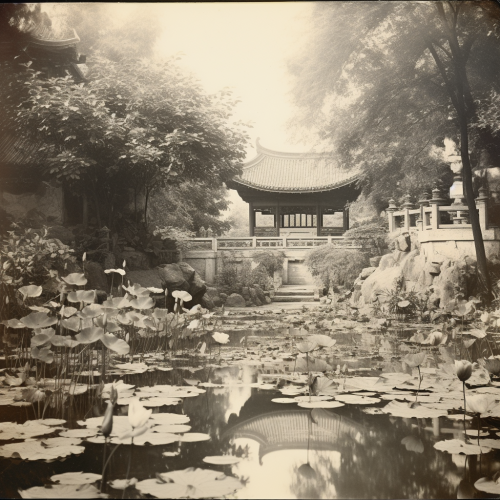 black and white old photo in 1920s, China, an old buddhist temple, view of its gate, white walls, the gate facing a water pond full of lotus, summer time