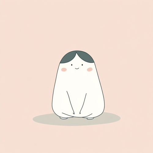 A soft, relaxing illustration of a character with a loose and friendly style, drawn with minimalistic lines and pastel colors. The character has a simple, rounded face with gentle features and a warm expression, standing or sitting in a relaxed pose. Use soft shading, smooth outlines, and an overall cozy, hand-drawn look, similar to minimalist Japanese-style art. Include a plain, light-colored background.