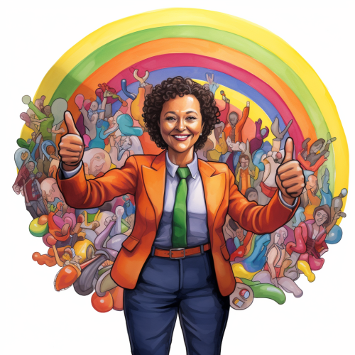 A fun, lighthearted image of a group of middle aged diverse business women celebrating a small win with a big smile. Age 45 years old. excited and playful. Wearing red and blue. Keywords: playful, celebration, high-five. Camera: DSLR, Lens: 35mm. Post: Bright, cheerful, with high contrast for a fun, celebratory feel. --ar 16:9