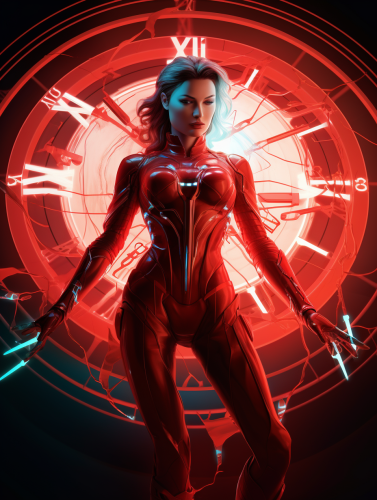 2d art, woman superhero, retro-futurism and high-tech design costume, bold crimson red costume with glowing tiffany neon accents, high-tech clock on the wrist, glowing sworf with energy in hand, full size body --ar 3:4 --v 5.2