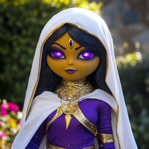 A sesame street, human muppet style basic puppet of Eclipse, Magic superhero, indian woman tan skin, neck-length hair, glowing purple eyes, purple expensive looking superhero costume with gold mystical accents, white hood with gold trim and white cape with gold trim, muppet style puppet skin