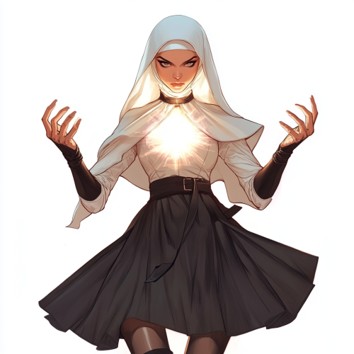 full body fierce catholic nun female superhero. skirt. glowing hands. white background. style of charlie bowater, laurie greasley and james jean, charlie bowater art style, beautiful comic art