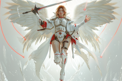 A female angel with white wings, full-body shot, in a fantasy art style, holding a sword and neon whip with a halo above her head, floating in the center of the image against a white light background, wearing white and red fantasy armor and elegant angel high-heel boots with light brown hair and a white cloak, in the style of Artgerm, with strong facial features and detailed eyes, in a symmetrical composition, in the style of Tom Bagshaw and Greg Rutkowski, 8k, --v 6.0 --ar 3:2 --no green, brown, purple