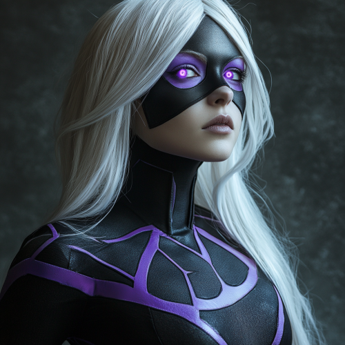 a female superhero with no mask wearing a black and purple costume inspired by black holes and stars, black eyes with purple pupils, long white hair, 30 years old, purple accents