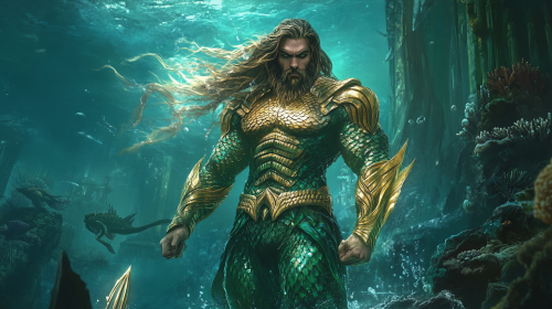 Create a powerful, cinematic image in a 16:9 format featuring a majestic, oceanic superhero inspired by Aquaman. He stands confidently in the depths of the ocean, wearing golden and green armor with intricate, scale-like details that reflect his deep connection to the sea. In one hand, he grips a glowing trident, pulsing with ancient, mystical energy. His long, flowing hair and beard move gently in the water, adding to his regal presence. Surrounding him is an underwater kingdom with towering coral structures and sea creatures swimming gracefully in the background. He stands firmly on a rocky seabed, water swirling around him as he exudes strength and authority. A faint, glowing aqua aura surrounds him, symbolizing his command over the ocean and all its creatures, as he looks ready to lead with wisdom and power as the king of Atlantis --ar 16:9