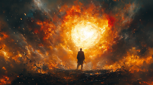 Depict a heroic figure standing victorious, holding a symbolic weapon of transformation like a sword. The hero stands over a defeated 'ego' figure, which is dark and fragmented, with chains and shattered material symbols scattered around. The hero is bathed in radiant, warm light, symbolizing enlightenment and inner strength. The background transitions from a chaotic and dark environment near the ego to a serene, glowing sky behind the hero, representing the triumph of spirit over ego. --ar 16:9 --s 750
