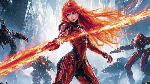 A beautiful, long-haired female warrior with vibrant red hair and blue eyes, dressed in a red strappy outfit, stands with her hair flowing in the wind. She holds a sword emitting an orange-red glow, fiercely facing off against multiple mechanical enemies. The warrior gazes forward in a battle stance, with flickering flames on the sword, adding dynamic energy and emphasizing the blade's power. The background is a 3d game style spaceship or corridor, scattered with various menacing robots, enhancing the tense, video-game-like atmosphere of this intense battle scene.