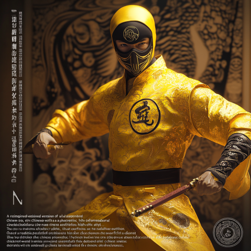 "A reimagined version of a Marvel superhero, styled with a traditional Chinese aesthetic, rendered in a photorealistic, high-definition cinematic style. The character wears a vibrant yellow outfit as the base color, intricately adorned with detailed Chinese patterns and designs that shimmer under dramatic lighting. The centerpiece of the costume is a large, bold Tai Chi symbol, prominently displayed on the chest, sharply contrasting against the vibrant yellow background. The iconic mask is reinterpreted with flowing lines and subtle dragon motifs, all captured with stunning clarity. In one hand, the character wields a high-tech peachwood sword, seamlessly blending ancient symbolism with modern technology, featuring glowing edges and intricate circuitry. This fusion of modern superhero flair with classic Chinese cultural elements is brought to life with a striking, cinematic realism, where the Tai Chi symbol and the high-tech sword stand out as defining features, emphasized by the depth and texture that only a high-definition movie scene can deliver."