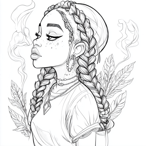 children's coloring page. Black girl with crystal points. Long braids with beads. Sage leaves with smoke. Outline. Black and white. --v 6.1 --quality 2