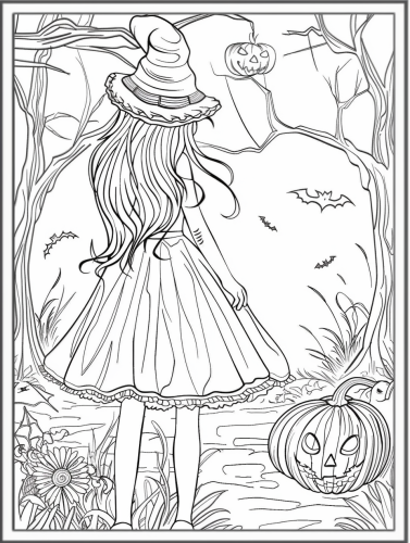coloring book page for teens, girl with undead features. the girl is sitting on a pumpkin. no shading, clean black lines, --style raw --v 6.0 --ar 3:4