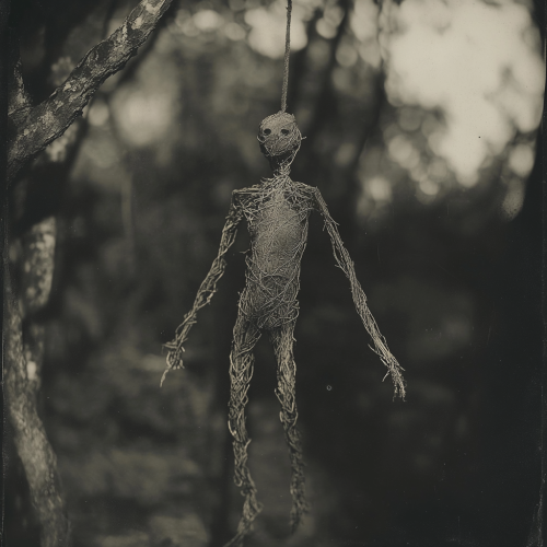 a 1920 wetplate closeup photo of a crude improvised wooden stick figure without facial features, made out of bound branches hanging in the tree from a thin rope, photo taken in a forest at night.