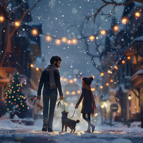 front view,A couple walking with their tabby cat on a snowy street at night, Christmas winter atmosphere, light snow on the ground, Pixar-style, 3D characters, front view, cozy and festive scene --v 6.0