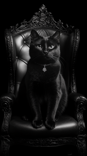 a slender black cat sitting in a royal throne wearing raiment --ar 3:4