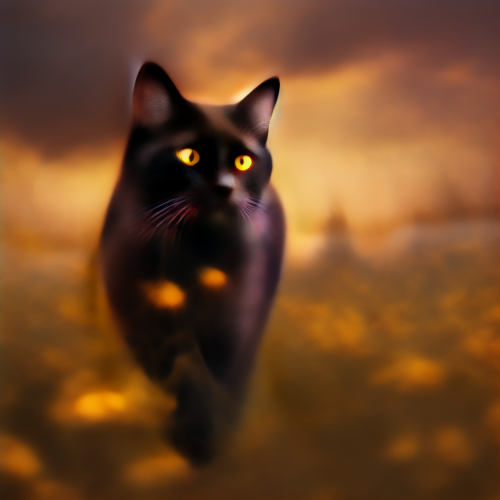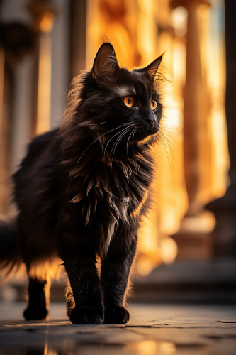 gothic black cat, side view, elegant walking, sleak fur, intense, castle, dramatic lighting, photorealistic, Leica M10-R 8k, Leica 35mm lens, Tilt Blur, Shutter Speed 1/ 1000, F/ 5.6, Super - Resolution, --ar 97:145 --s 250 --v 5.2