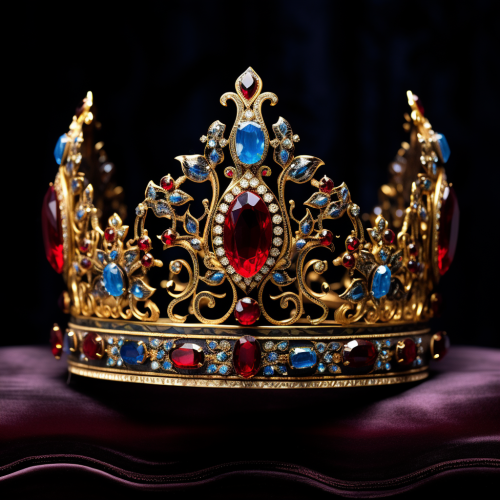 A heavily jeweled thick tiara on a black display stand, fine gold weave, ruby, saphire, opal