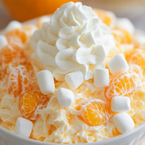 Close-up of a bowl of orange creamsicle fluff dessert. The dish is a creamy, fluffy mixture with small mandarin orange segments and mini marshmallows scattered throughout. A swirl of whipped cream is placed on top as a garnish, adding a soft, airy touch. The light, pastel orange color of the fluff contrasts with the bright mandarin oranges and the white marshmallows. The background shows a blurred countertop, keeping the focus on the refreshing and indulgent dessert