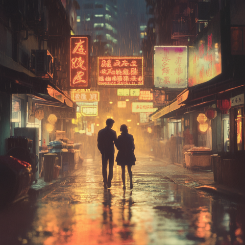 A nostalgic, softly lit Hong Kong street scene at twilight, with neon signs in both traditional Chinese characters and simplified Chinese glowing gently in the evening air. A couple walks hand-in-hand under glowing lanterns, their silhouettes framed by reflections from rain-soaked cobblestone streets. In the background, soft romantic music notes float through the air, blending Cantonese and Mandarin lyrics. Vintage record players and old concert posters of Cantonese and Mandarin artists like Leslie Cheung and Teresa Teng are subtly displayed in a nearby window. The mood is warm, intimate, and filled with the timeless charm of love and music crossing cultures.