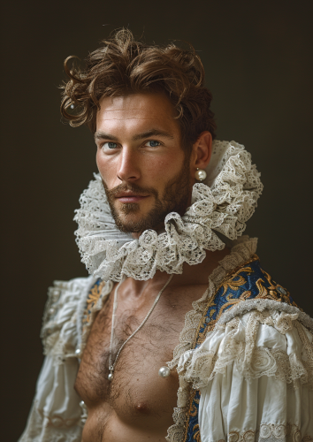 Posing for Dutch Physique Pictorial 1650s, Best quality vintage photo portrait by the great dutch masters of Royal guards man of the year, old goat, wearing a white 17th century ruff lace high collar and one solitary pendant pearl earing, a hairy body, defined hairy chest hairy abs, lavish english textiles tapestries, white delft blue gold embroidery, 17th century gothic, bright lighting, front portrait view flirting with the camera, natural light, portrait, studio photo, head level, photorealism, historically accurate, zeiss batis 18mm f/2.8, dimitra milan, handcrafted beauty, arman manookian, henry justice ford, stone, lnatural light, portrait, studio photo, head level, photorealism, historically accurate, 8k resolution. --no blemishes watermarks scars text --ar 5:7 --stylize 350