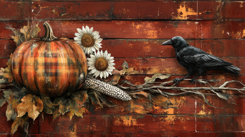 Crackled pumpkin with a plaid pattern in dark muted tones, accompanied by white grunge sunflowers and a raven resting on a corn stalk. The scene is set against a dark red chippy wood slat background, with subtle watercolor effects capturing the essence of autumn. --ar 16:9